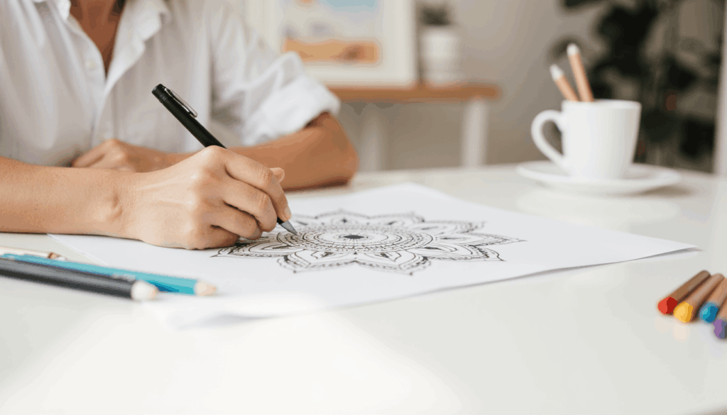 Wenn du gestresst bist, sind einfache, wiederkehrende Bewegungen oft viel hilfreicher als komplexe Projekte. Beim Ausmalen von Mandalas musst du nichts planen, nichts entscheiden und nichts perfekt machen. Du fängst einfach an.