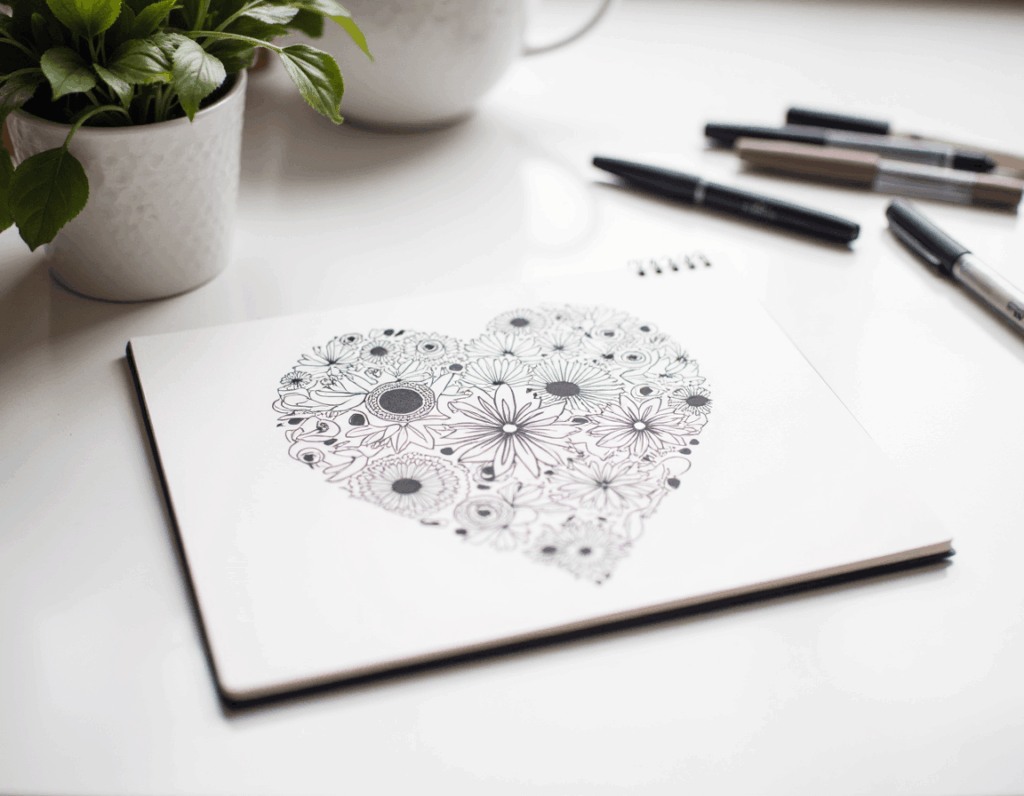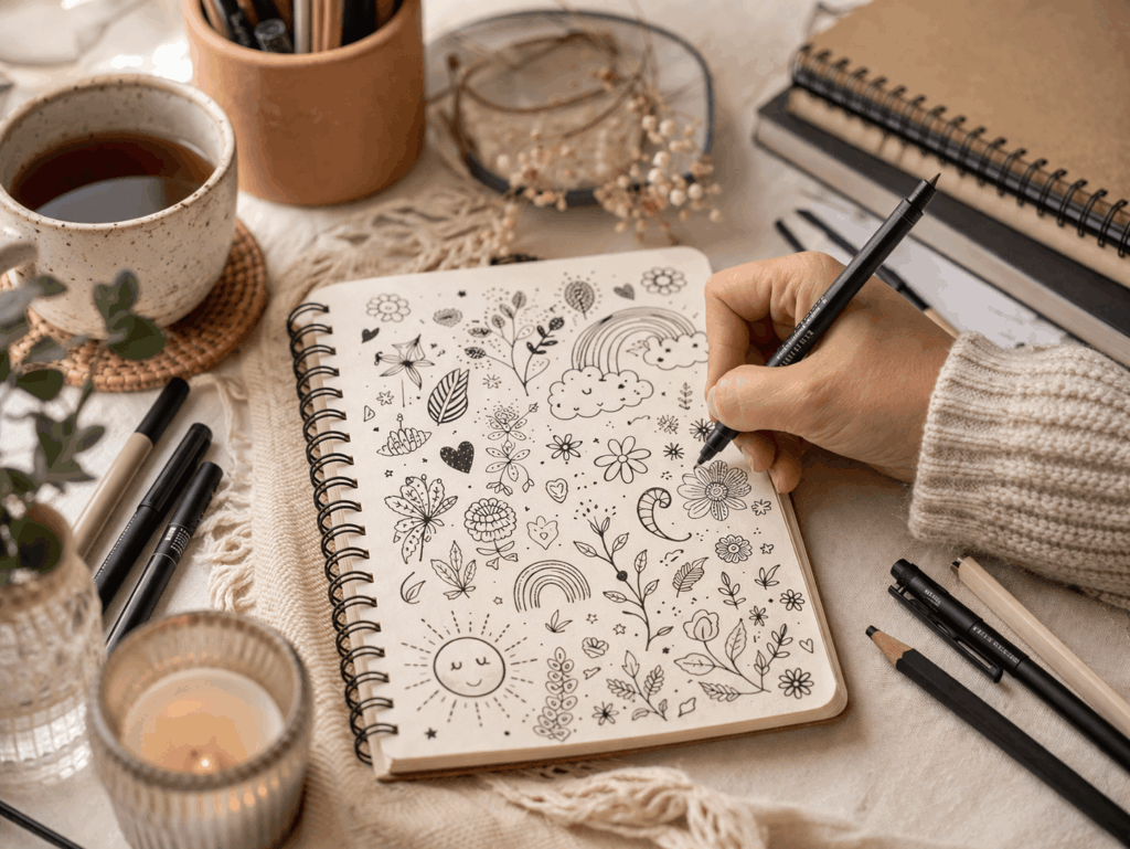 Du brauchst keine Vorbereitung, kein besonderes Material und keinen Plan. Ein Stift und ein Blatt Papier reichen. Dann zeichnest du einfach kleine Formen, Blumen, Linien, Gesichter, Muster oder Symbole – ganz ohne Anspruch.